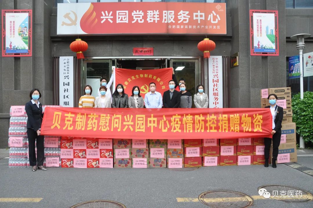 4月28日下午,安徽贝克制药董事长王志邦,副总经理王哲、贝克生物党支部书记兼贝克制药副总经理蔡薇等冒雨来到合肥兴园党群服务中心、城西桥中心,向社区捐赠口罩、消毒水、矿泉水、方便面等防疫物资,高新区党工委委员,管委会副主任罗敏,兴园中心党委副书记张爽出席捐赠仪式,公司支部在肥部分党员参加活动。